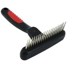 Rakes are designed with wide set teeth to pass through topcoats and remove tangles and dead undercoat fur near the dogās skin. The brushes often shaped like a shaving razor and have one or two rows of pins. They are intended to be used with minimal, even pressure, as pressing hard could damage your dog's skin. When selecting a rake, look for one with pins that are similar to your dogās fur length. Ones that are too short won't reach the the inner layer of undercoat, and ones that are too long could hurt the skin.